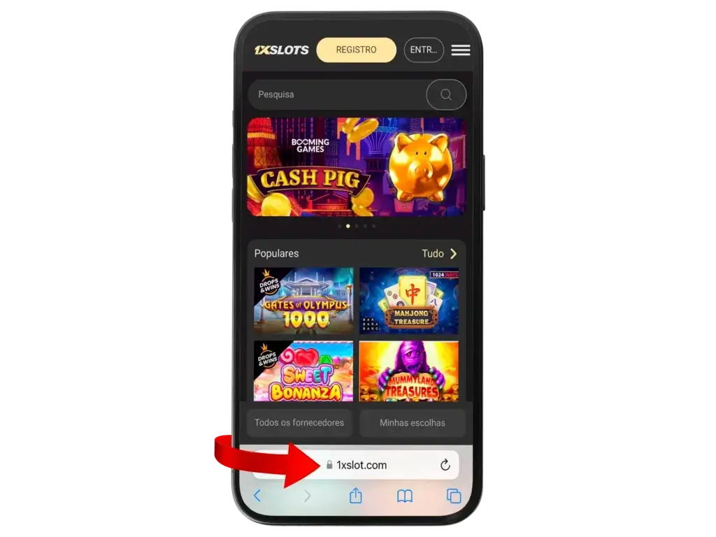 - Abre Safari (o el navegador habitual) y entra al sitio oficial de 1xSlots.